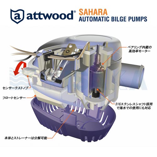 アトウッド社製のフロートセンサースイッチを内蔵したオートマチックビルジポンプ「サハラ」シリーズです。316ステンレスが採用されたモーターシャフトは耐腐食性に優れ、海水での使用にも安心して使用できます。フロートセンサー用のテストノブが外側に装備されているので航行前の作動点検も容易におこなえます。また、フロートセンサーの誤作動防止の為、定期的にプラスチックストレーナーから本体を外し異物が混入していないか点検してください。