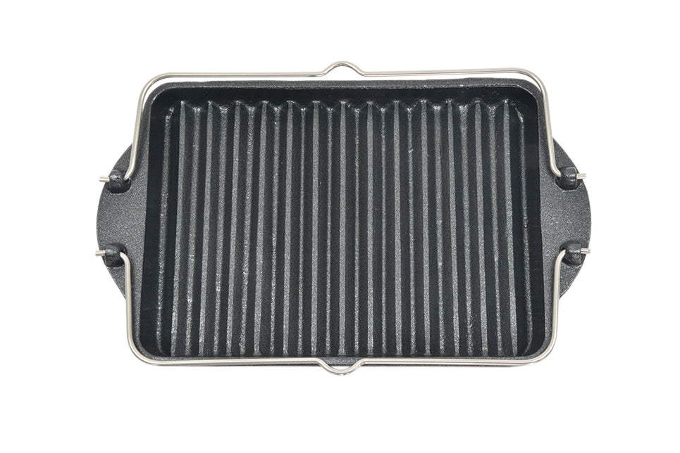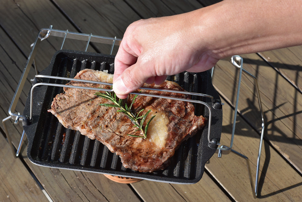 耐食性、熱伝導性に優れ表面もこんがりおいしく焼けるアルミ鋳物製黒メタリックのフッ素コーティングで焦げ付きにくく、波状の焼き面が余分な油を落とします火からサーブするのに便利なステンレス取っ手付き